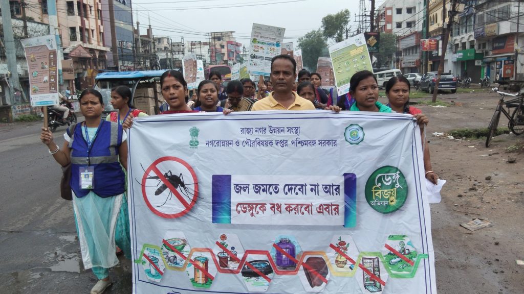 आसनसोल: पूरे प्रदेश के साथ-साथ आसनसोल शिल्पांचल में भी डेंगू का कहर बढ़ता जा रहा है इसे लेकर आसनसोल नगर निगम की तरफ से युद्ध स्तर पर प्रयास किये जा रहे हैं इसी क्रम में आसनसोल नगर निगम के बोरो नंबर 4 के सेनेटरी विभाग के अधिकारियों द्वारा एक जागरूकता रैली निकाली गई 41 नंबर वार्ड इलाके में निकली इस रैली में इस बोरो के कर्मचारियों ने हाथों में तख्तियां थाम रखी थी जिस पर डेंगू से बचाव के उपाय बताए गए थे इस बारे में यहां के एक अधिकारी मोहम्मद हिदायतुल्लाह ने बताया कि बीते वर्षों की तुलना में इस साल आसनसोल में डेंगू कुछ ज्यादा मात्रा में फैल रही है इसकी रोकथाम के लिए आसनसोल नगर निगम पूरी तरह से कटिबद्ध है इसी क्रम में आज यह जागरूकता रैली निकाली गई है इसके साथ ही उन्होंने कहा कि निगम के जो निर्मल साथी हैं वह लोगों के घर-घर जा रहे हैं और जहां भी पानी जमा हुआ देख रहे हैं उस पानी को फेंक दे रहे हैं तथा लोगों को पानी जमाना करने की सलाह दे रहे हैं इसके साथ ही जहां भी भवन निर्माण का काम हो रहा है वहां पर नगर निगम के स्प्रे करने वाले कर्मचारी जा रहे हैं और कीटनाशकों का छिड़काव करके डेंगू के मच्छरों के लार्वा को नष्ट कर रहे हैं