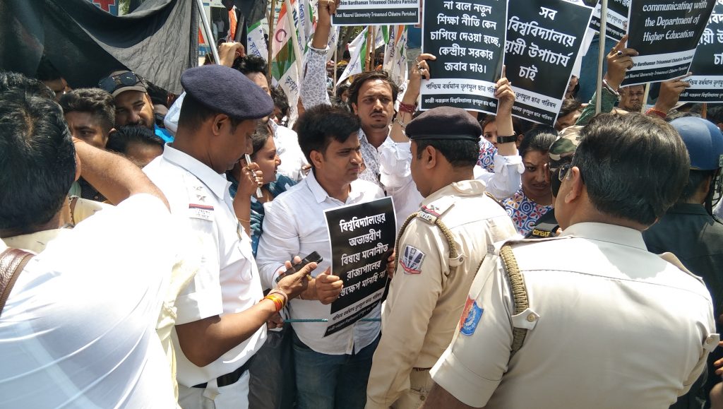 आसनसोल :पश्चिम बंगाल के राज्यपाल और काजी नजरूल विश्वविद्यालय के कुलपति सी वी आनंद बोस आज आसनसोल के कल्ला इलाके में स्थित काजी नजरूल विश्वविद्यालय पहुंचे यहां पर विश्वविद्यालय का चौथा कन्वोकेशन कार्यक्रम आयोजित किया गया लेकिन तृणमूल कांग्रेस छात्र परिषद और टीएमसी समर्थित कॉलेज अध्यापकों के संगठन वेबकुपा की तरफ से राज्यपाल के काफिले को काले झंडे दिखाए गए और राज्यपाल गो बैक के नारे लगाए गए इस अभियान को देखते हुए आसनसोल दुर्गापुर पुलिस कमिश्नरेट की तरफ से कल्ला मोड पर सुरक्षा के पुख्ता इंतजाम किए गए थे भारी संख्या में पुलिस अधिकारियों और रैपिड एक्शन फोर्स की तैनाती की गई थी जब राज्यपाल का काफिला यहां से गुजरा तब तृणमूल छात्र परिषद के सदस्यों ने उन्हें काले झंडे दिखाये और राज्यपाल गो बैक के नारे लगाए इस बारे में टीएमसीपी के पश्चिम वर्धमान जिला अध्यक्ष अभिनव मुखर्जी ने कहा कि वह विश्वविद्यालय में कन्वोकेशन के खिलाफ नहीं है लेकिन जिस पद्धति से इसे किया जा रहा है वह इसके खिलाफ है उन्होंने कहा कि यह विश्वविद्यालय मुख्यमंत्री ममता बनर्जी के सपनों का विश्वविद्यालय है लेकिन आज राज्यपाल और इस विश्वविद्यालय के वाइस चांसलर भाजपा की दलाली करते हुए राज्य सरकार के निर्देशों की अनदेखी कर रहे हैं उन्होंने कहा कि राज्य सरकार द्वारा इस समय कन्वोकेशन करने से मना किया गया था लेकिन यहां पर फिर भी कन्वोकेशन किया जा रहा है इसी के खिलाफ यह आंदोलन किया जा रहा है उन्होंने कहा कि वह ना तो राज्यपाल और नहीं यहां के वाइस चांसलर को भाजपा की दलाली करने देंगे क्योंकि इस विश्वविद्यालय को बनाने में ममता बनर्जी ने काफी मेहनत की है और तृणमूल छात्र परिषद इसे कभी बर्बाद होने नहीं देगा ना ही इस विश्वविद्यालय को राजनीति का अखाड़ा बनने देगा