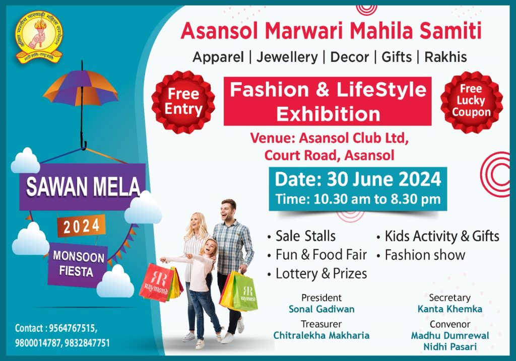 आसनसोल :आसनसोल मारवाड़ी महिला समिति ने हर बार की तरह इस वर्ष भी, “सावन मेला 2024” का आयोजन किया है। यह मेला 30 जून 2024 को आसनसोल क्लब, कोर्ट रोड, आसनसोल में सुबह 10:30 बजे से रात 8:30 बजे तक चलेगा।
