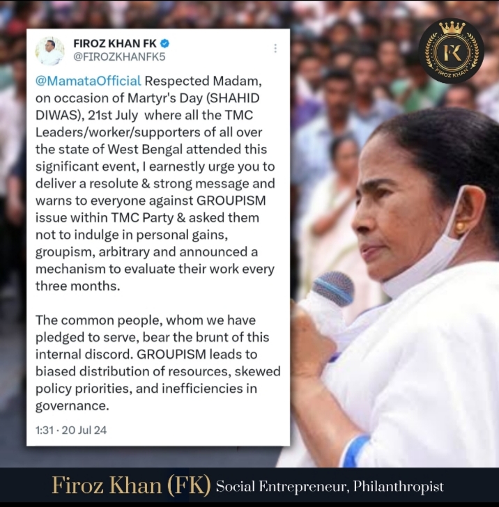 आसनसोल :शहीद दिवस के अवसर पर एफके ग्रुप और आईसीएससी के चेयरमैन, फिरोज खान एफके ने मुख्यमंत्री ममता बनर्जी को एक आधिकारिक ईमेल और ट्वीट (एक्स) भेजा है। उन्होंने ममता बनर्जी से सभी टीएमसी नेता, जिला समितियां और पार्टी कार्यकर्तायों को गुटबाजी के खिलाफ कड़ा संदेश देने का आग्रह किया। उन्होंने अपने पत्र के जरिए मुख्यमंत्री से अनुरोध किया की टीएमसी नेता और कार्यकर्ता निजी स्वार्थों से ऊपर उठकर काम करें और किसी भी प्रकार के आर्बिटरी कार्यों में संलिप्त न हो। फिरोज खान एफके ने ममता बनर्जी से अनुरोध किया कि हर तीन महीने में उनके नेताओं के कार्यों की समीक्षा की जाए। अपने पत्र के जरिए फिरोज खान एफके ने कहा कि गुटबाजी की वजह से शासन प्रणाली संसाधनों का समुचित बंटवारा प्रभावित हो रहा है जिससे आखिर में आम आदमी का विकास प्रभावित हो रहा है