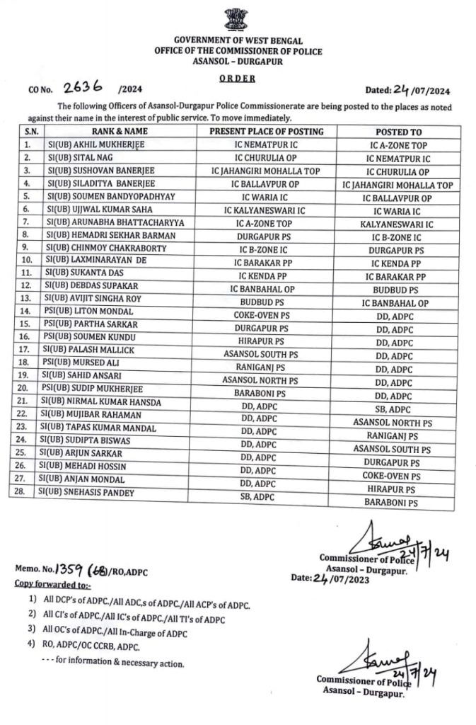 आसनसोल : आसनसोल दुर्गापुर पुलिस कमिश्नरेट की तरफ से 11 फांड़ी प्रभारीयों के साथ ही 28 सब इंस्पेक्टरों का तबादला किया गया है। आसनसोल दुर्गापुर पुलिस कमिश्नरेट के आयुक्त किए आदेश जारी किया माना जा रहा है कि आप थानेदारों का जल्दी किया जाएगा 11 फांड़ी प्रभारीयों के अलावा डीडी से जुड़े सब इंस्पेक्टर का भी सवाल किया गया से ए जोन टीओपी शीतल नाग को नियामतपुर में भेजा गया है । सुशोभन बैनर्जी को चुरुलिया टीओपी शिलादित्य बैनर्जी को जहांगीरी मोहल्ला टीओपी का प्रभारी बनाया गया है।