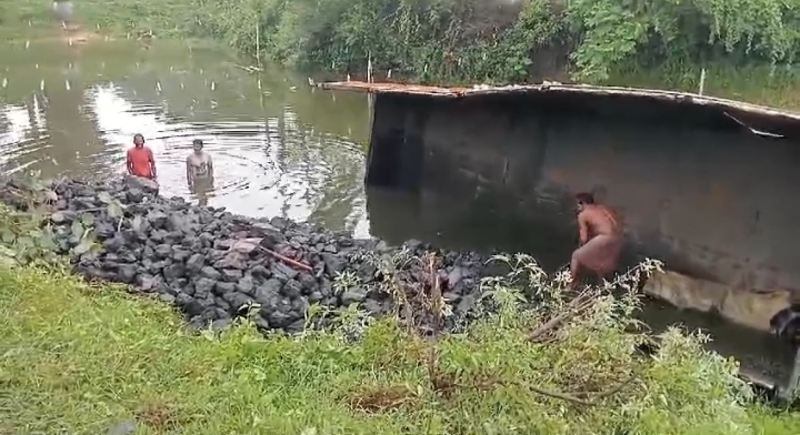 जमुड़िया के तालतोड़ में तालाब में पलटी ट्रक इलाके में आतंक:
