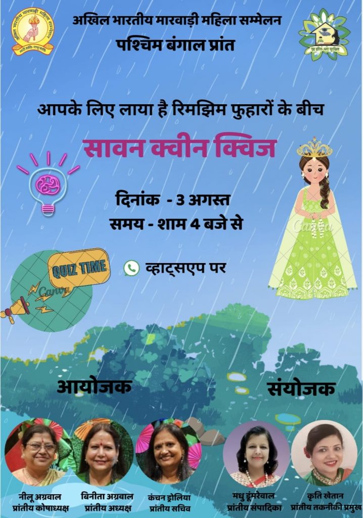 आसनसोल :आने वाले सावन तीज के अवसर पर अखिल भारतीय मारवाड़ी महिला सम्मेलन, पश्चिम बंगाल प्रांत अध्यक्ष बिनीता अग्रवाल की अध्यक्षता में सावन क्विज क्वीन ऑनलाइन प्रतियोगिता का आयोजन हुआ जिसमें सभी सदस्यों का उत्साह देखते ही बनता था। प्रतियोगिता की शुरुआत सम्मेलन के पारंपरिक तरीके से ओम के उच्चारण और प्रार्थना से की गई। सभी सम्मानित अतिथियों का प्रदेश अध्यक्ष बिनीता अग्रवाल द्वारा स्वागत किया गया।
