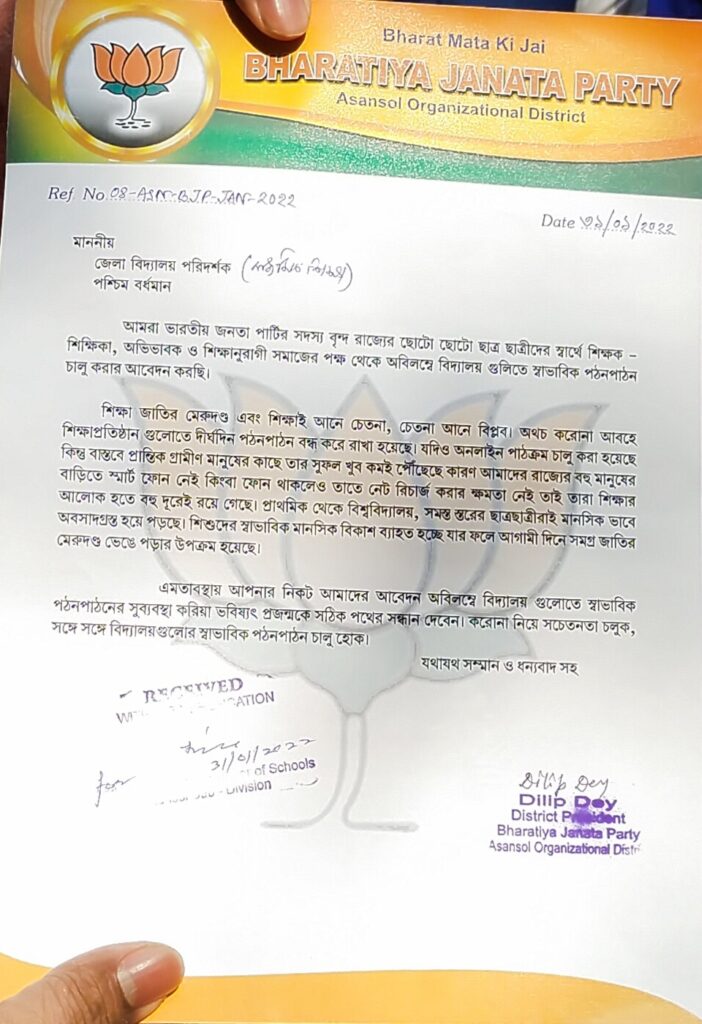 1 min readआसनसोल टाइम्स : कोरोना के कारण पिछले 2 वर्षों से पूरे राज्य में प्राथमिक स्तर पर स्कूलों में पठन-पाठन बंद है इसके खिलाफ आज भाजपा की तरफ से आसनसोल में डीआई ऑफिस वह ज्ञापन सौंपा गया इस मौके पर भाजपा नेता जितेंद्र तिवारी कृष्णेदु मुखर्जी 43 नंबर वार्ड से भाजपा प्रत्याशी आशा शर्मा सहित और भी कई भाजपा कार्यकर्ता उपस्थित थे इस मौके पर कृष्णदु मुखर्जी ने कहा कि पिछले 2 सालों से प्राथमिक स्तर पर इस राज्य के बच्चों की शिक्षा को अंधकार में धकेल दिया गया है शराब की दुकानें खुली हुई हैं लेकिन विद्यालय बंद है और अब एक नया शिगूफा छोड़ा गया है मोहल्ले में पाठशाला बच्चों को मैदानों में और पेड़ों के नीचे पठन पाठन करने के लिए मजबूर किया जा रहा है ।