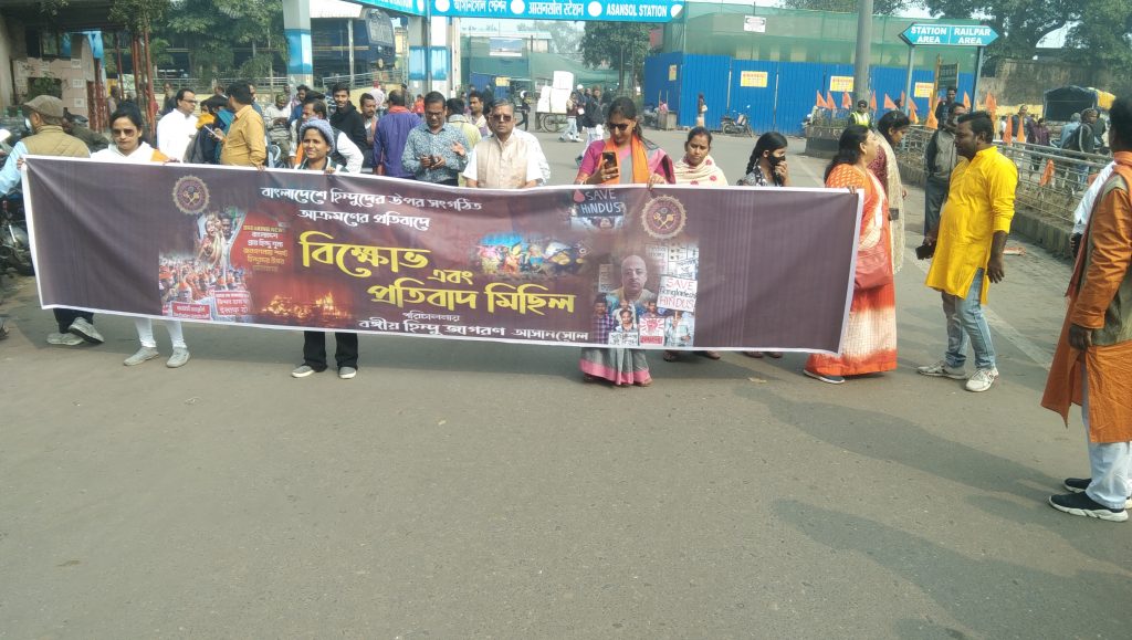 आसनसोल :बांग्लादेश में हिंदुओं पर हो रहे अत्याचार के खिलाफ आज आसनसोल रेलवे स्टेशन से बंगिय हिंदू जागरण की तरफ से एक विरोध रैली निकाली गई इस विरोध रैली में बड़ी संख्या में लोग शामिल हुए जिन्होंने बांग्लादेश में हिन्दू संप्रदाय के लोगों पर हो रहे अत्याचार का तीव्र विरोध किया उन्होंने हाथों में बैनर और प्लैकॉर्ड थाम रखे थे । इनमें बांग्लादेश में इस्कॉन के चिन्मय कृष्ण प्रभु को जेल से तुरंत रिहा करने की मांग लिखी हुई थी इस मौके पर मौजूद लोगों ने बांग्लादेश में जिस तरह से मोहम्मद यूनुस के अंतरिम सरकार के नेतृत्व में हिंदुओं के खिलाफ अत्याचार हो रहा है उसकी कड़ी निंदा की और भारत सरकार से मांग की की अविलंब ऐसी व्यवस्था लें जिससे कि बांग्लादेश में हिंदुओं पर हो रहे अत्याचार को रोका जा सके इस बारे में जब हमने बंगिय हिंदू जागरण के अमित सरकार से बात की तो उन्होंने कहा कि एक समय था जब बांग्लादेश और आज का पश्चिम बंगाल एक हुआ करता था उन्होंने कहा कि भारत के तमाम बुद्धिजीवी कवि साहित्यकार बड़े-बड़े वैज्ञानिक स्वतंत्रता सेनानी बांग्लादेश में जन्मे है जिन्होंने आजादी से पहले भारत की आजादी के लिए अपने प्राण न्योछावर किए थे ऐसे बहुत से कवि साहित्यकार बुद्धिजीवी हैं जिन्होंने भारत आकर अपनी प्रतिभा को निखारा था। उन्होंने कहा कि एक समय बांग्लादेश में हिंदुओं की जितनी संख्या थी वह आज बहुत घट गई है यह चिंता का विषय है उन्होंने कहा कि बांग्लादेश में जिस तरह से हिंदुओं पर अत्याचार हो रहा है वह तुरंत बंद होना चाहिए और इसी के समर्थन में आज आसनसोल रेलवे स्टेशन परिसर से लेकर कोर्ट मोड तक रैली निकाली गई