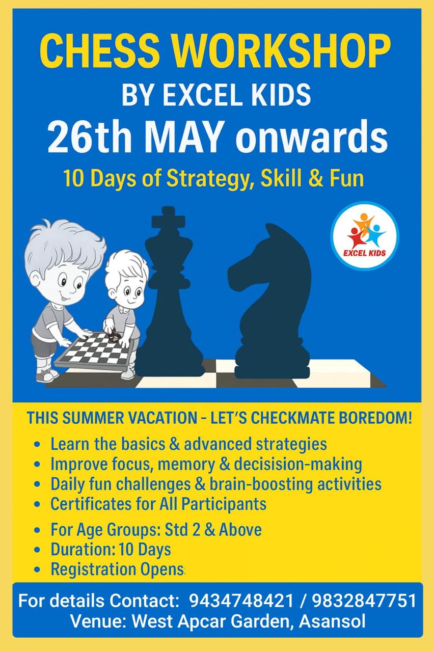 आसनसोल: बच्चों की गर्मी की छुट्टियों को रोचक, रचनात्मक और मस्तिष्क विकास से भरपूर बनाने के उद्देश्य से एक्सेल किड्स, आसनसोल द्वारा 10 दिवसीय चेस वर्कशॉप का आयोजन किया जा रहा है, जो 26 मई 2025 से प्रारंभ होकर वेस्ट अपकार गार्डन स्थित सेंटर में प्रतिदिन आयोजित होगी।