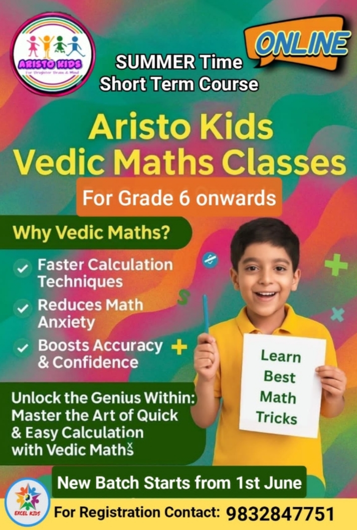 गर्मियों की छुट्टियों को बच्चों के लिए उपयोगी और मजेदार बनाने के उद्देश्य से एक्सेल किड्स, आसनसोल द्वारा “वेदिक गणित ऑनलाइन समर कोर्स” की नई बैच की शुरुआत 2 जून से की जा रही है। यह शॉर्ट टर्म कोर्स कक्षा 6 एवं उससे ऊपर के विद्यार्थियों के लिए विशेष रूप से तैयार किया गया है।