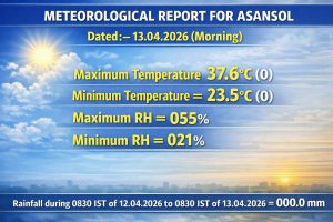 Uncategorized आसनसोल टाईम्स पर जानिए कैसा रहेगा आज सुबह का मौसम आपके शहर आसनसोल में 1 min read 5 days ago admin Post Views: 8 Meteorological Report for Asansol Dated:-13.04.2026 (Morning) Maximum Temperature=37.6°C (0) Minimum Temperature=23.5°C (0) Maximum RH=055% Minimum RH=021% Rainfall during 0830 IST of 12.04.2026 to 0830 IST of 13.04.2026= 000.0 mm Continue Reading Previous कांग्रेस प्रत्याशी प्रसनजीत पुईतुंडी ने आसनसोल नगर निगम के 22 नंबर वार्ड में किया चुनाव प्रचारNext भाजपा की तरफ से आसनसोल उत्तर विधानसभा चुनाव कार्यालय में संवाददाता सम्मेलन ममता बनर्जी के वक्तव्य का दिया गया बिंदुवार जवाब