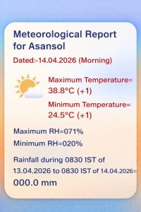 Uncategorized आपके शहर आसनसोल में आज सुबह कैसा रहेगा मौसम जानिए आसनसोल टाईम्स पर 1 min read 4 days ago admin Post Views: 7 Meteorological Report for Asansol Dated:-14.04.2026 (Morning) Maximum Temperature=38.8°C (+1) Minimum Temperature=24.5°C (+1) Maximum RH=071% Minimum RH=020% Rainfall during 0830 IST of 13.04.2026 to 0830 IST of 14.04.2026= 000.0 mm Continue Reading Previous आईए जानते हैं आज शाम आपके शहर आसनसोल में कैसा रहेगा मौसम सिर्फ आसनसोल टाईम्स परNext कांग्रेस की तरफ से 23 अप्रैल के मतदान के लिए जारी मतदाता सूची को लेकर उठाए गए गंभीर सवाल मतदाता सूची में गड़बड़ी का लगाया आरोप