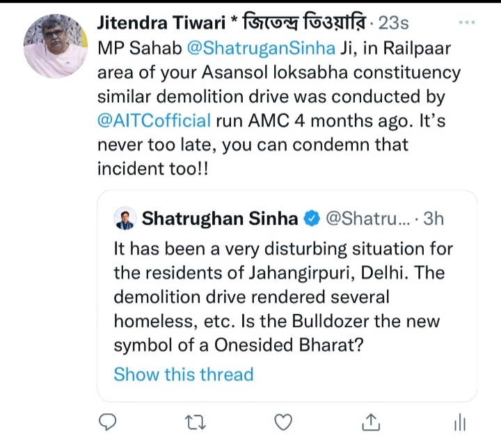 आसनसोल: दिल्ली के जहांगीरपुरी इलाके में अवैध अतिक्रमण को तोड़ने का मुद्दा धीरे-धीरे सियासी रंग लेता जा रहा है इस मुद्दे की गूंज अब आसनसोल में भी सुनी जा रही है आसनसोल के पूर्व मेयर और भाजपा नेता जितेंद्र तिवारी ने शत्रुघ्न सिन्हा के उस ट्वीट पर पलटवार किया जिसमें शत्रुघ्न सिन्हा ने कहा था की जिस तरह से जहांगीरपुरी में बुलडोजर चलाया गया वह दुर्भाग्यपूर्ण था उन्होंने कहा कि क्या इस तरह से बुलडोजर चलाकर नए एक तरफा भारत का निर्माण किया जा रहा है उन्होंने कहा कि क्या बुल डोजर ही नए एकतरफा भारत का प्रतीक बनता जा रहा है शत्रुघ्न सिन्हा का कहना था कि जिस तरह से बुलडोजर चलाकर सैकड़ों परिवारों को गृह हीन कर दिया गया वह सही नहीं हुआ इस पर जितेंद्र तिवारी ने पलटवार करते हुए कहा की यह अच्छा होता कि शत्रुघ्न सिन्हा रेलपार में चार-पांच महीने पहले चलाए गए ऐसे ही एक अभियान की भी निंदा करते जहां कई अल्पसंख्यक परिवारों के घरों दुकानों को तोड़ा गया था उन्होंने कहा कि अभी भी ज्यादा देर नहीं हुई है और पवित्र रमजान महीने में अगर शत्रुघ्न सिन्हा उस घटना की निंदा कर लें तो बेहतर होगा । हालांकि जितेंद्र तिवारी के इन दावों को खारिज करते हुए टीएमसी पार्षद वसीम उल हक ने कहा कि नगर निगम की तरफ से चार-पांच महीने पहले जो अभियान चलाया गया था उसमें किसी भी गरीब दुकानदार की दुकान या उसका घर नहीं तोड़ा गया था जहां प्रशासनिक कार्यालय बनने वाले हैं उन जमीनों पर कुछ लोग अवैध अतिक्रमण कर रहे थे उस अतिक्रमण को रोका गया था इसके अलावा और कुछ नहीं किया गया था साथ ही उन्होंने कहा कि रेलपार में सिर्फ अल्पसंख्यक समुदाय के लोगों की दुकानें ही नहीं है अन्य समुदाय के लोग भी यहां रहते हैं और अपना व्यापार करते हैं उन्होंने रेलवे विभाग पर इन लोगों को बिना पुनर्वास के हटाने का आरोप लगाया और कहा कि राज्य सरकार जब किसी को भी कहीं से हटाती है तो उसको उचित मुआवजा देकर हटाती है। उन्होंने भाजपा पर धार्मिक भावनाओं को भड़का कर देश में अशांति फैलाने और देश के सांप्रदायिक सौहार्द को नष्ट करने का आरोप लगाया