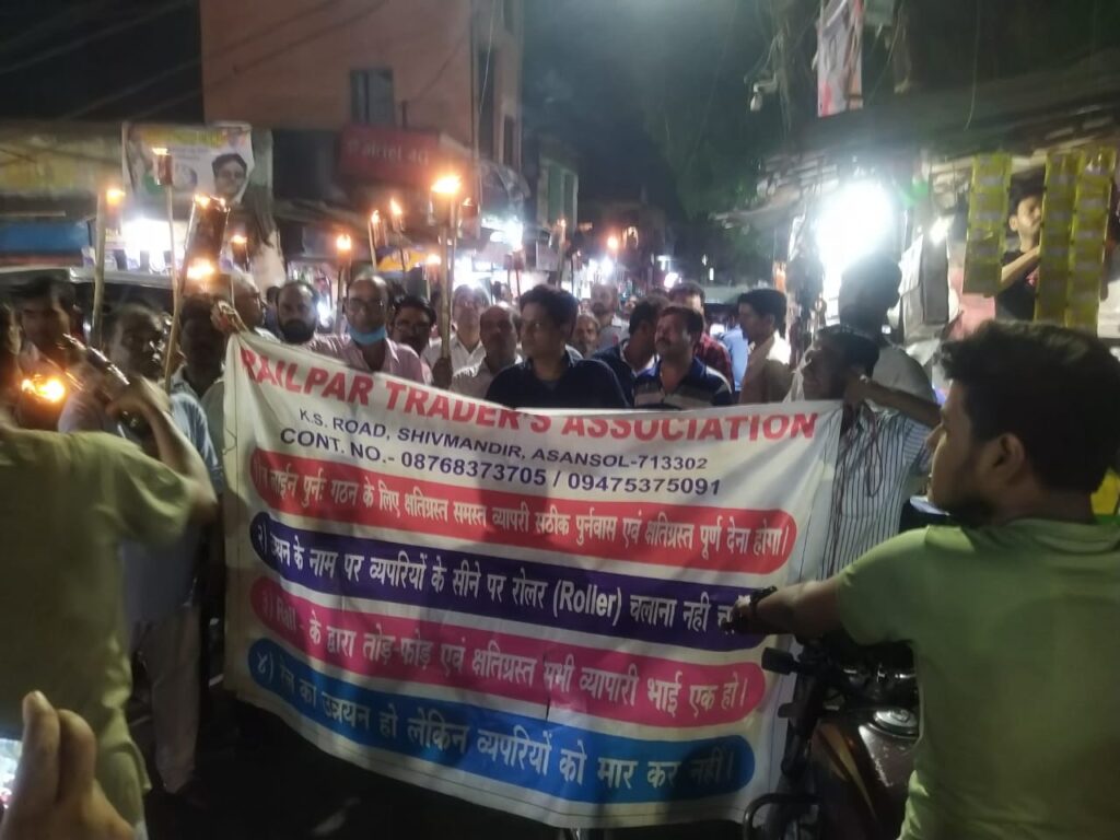 रेलपार ट्रेडर्स एसोसिएशन ने पुनर्वास और मुआवजे की मांग पर निकाली मशाल रैली: