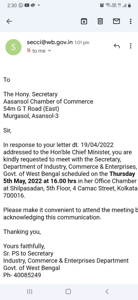 आसनसोल आसनसोल चेम्बर आफ कामर्स के सचिव शम्भु नाथ झा के द्वारा 20 अप्रैल को कलकता में हुए बंगाल ग्लोबल बिजनेस समिट में मुख्यमंत्री को दिये प्रस्ताव के जवाब में मुख्यमंत्री के निर्देश पर आज उद्योग मंत्रालय से मेल के द्वारा आगामी 5 मई को शाम 4 बजे बैठक में भाग लेने का आमंत्रण मिला है । आमंत्रण पाकर सचिव ने कहा ये आसनसोल चेम्बर आफ कामर्स के लिए गर्व की बात है। उन्होंने मुख्यमंत्री का आभार प्रकट किया कि इतनी जल्द हमलोगों की सुझाव को समझते हुए उन्होंने सम्बंधित विभाग को निर्देश दिया है । 5 मई को आसनसोल चेम्बर आफ कामर्स का एक प्रतिनिधिमंडल कलकत्ते जाकर सम्बंधित विभाग के अधिकारियों के साथ बैठक करेगा ।