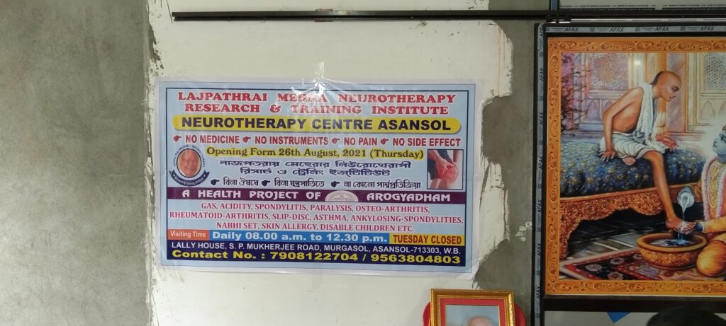रविवार को आसनसोल के जीटी रोड के किनारे स्थित महावीर स्थान मंदिर परिसर में लाजपतराय मेहरा न्यूरो थेरेपी रिसर्च एंड ट्रेनिंग इंस्टिट्यूट द्वारा एक न्यूरो थेरेपी शिविर लगाया गया यहां 40 लोगों का न्यूरो थेरेपी के जरिए मुफ्त इलाज किया गया । इस मौके पर न्यूरो थेरेपीस्ट डॉक्टर सुकुमार सिंह राय ने कहा कि आज इस शिविर के दौरान तकरीबन 40 लोगों का मुफ्त इलाज किया गया उन्होंने कहा कि उनकी चिकित्सा पद्धति में ना तो दवा की जरूरत होती है और ना ही किसी मशीन की भारतीय पारंपरिक तरीके से स्पांडिलाइसिस लेकर हड्डियों के जटिल रोग पेट की बीमारी सहित तमाम रोगों का इलाज किया जाता है उन्होंने बताया कि वह दुर्गापुर से यहां आज शिविर के लिए आए हैं लेकिन आसनसोल के मुर्गा सोल में डॉक्टर रानीत पाल की देखरेख में रोज मरीजों का इलाज किया जाता है ।