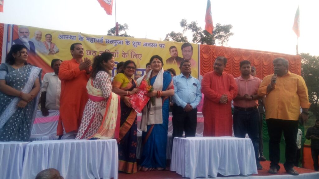 छठ पूजा के अवसर पर 27 नंबर वार्ड में भाजपा नेत्री चैताली तिवारी के नेतृत्व में बांटी गईं साड़ियां:
