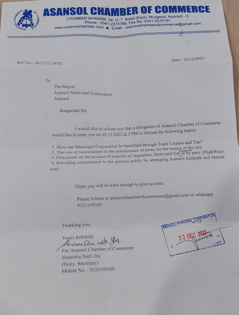 आसनसोल चैम्बर ऑफ कामर्स सचिव शंभूनाथ झा ने मेयर को पत्र लिखकर मिलने के लिए मांगा समय: