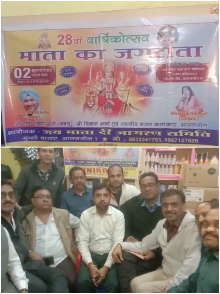 आसनसोल :जय माता दी जागरण समिति की तरफ से उनके अस्थाई कार्यालय में एक बैठक का आयोजन किया गया। इस मौके पर पत्रकारों को जानकारी देते हुए जय माता दी जागरण समिति के सदस्य आनंद पारिख ने बताया कि संस्था की तरफ से बहुत जल्द 28वा वार्षिक उत्सव मनाया जाएगा इसीको लेकर आज की बैठक में चर्चा हुई । उन्होंने 2 फरवरी को आसनसोल के एन एस रोड स्थित रामकुमार मन्नालाल धर्मशाला में माता के 28वे जगराता का आयोजन होने जा रहा है । इसके साथ ही माता का भव्य दरबार लगेगा माता की अलौकिक ज्योत जलाई जाएगी माता का श्रृंगार होगा । उन्होंने बताया कि कानपुर से आए भजन गायक सुरजीत सिंह अलबेला मुख्य रूप से भजन प्रस्तुत करेंगे । वह पहले भी यहां आ चुके हैं । इनके अलावा इलाहाबाद की पूजा केसरवानी रवि शंकर शर्मा बबलू विक्रम शर्मा और स्थानीय भजन मंडली के गायक भी माता के दरबार में हाजरी लगाएंगे । आनंद पारिख ने बताया कि हर साल इस वार्षिक उत्सव में आसनसोल ही नही बल्कि बर्नपुर रानीगंज कुल्टी बराकर सहित अन्य जगहों से भी भक्त आते हैं और माता के दरबार मे हाजरी लगाते हैं । उन्होंने इस साल भी सबसे 2 फरवरी को दोपहर 3 बजे से एन एस रोड स्थित रामकुमार मन्नालाल धर्मशाला पधारने का अनुरोध किया।