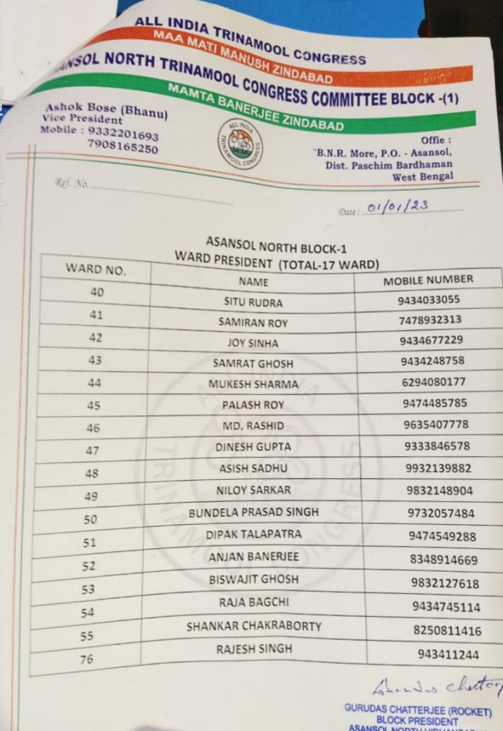 आसनसोल नार्थ ब्लॉक एक टीएमसी के 17 वार्ड अध्यक्षों के नामों की हुई घोषणा: