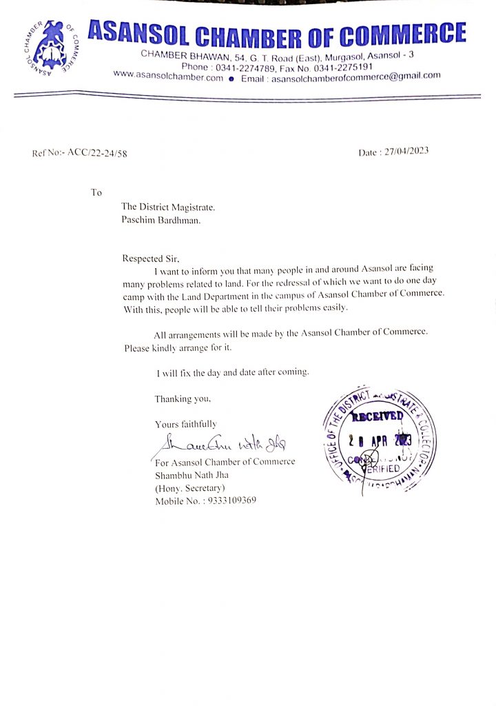 आसनसोल :आसनसोल चेंबर आफ कामर्स के सचिव शंभूनाथ झा ने पश्चिम बर्धमान जिला शासक को एक पत्र लिखकर एक बेहद महत्वपूर्ण विषय की तरफ उनका ध्यान खींचा है। पत्र में इन्होंने लिखा है कि आसनसोल एवं आस पास के बहुत सारे लोगों को जमीन से सम्बन्धित बहुत सारी समस्याएं हैं। जिसके निवारण के लिए आसनसोल चेम्बर आफ कामर्स के परिसर में एक दिन का शिविर लगाना चाहते हैं जो कि लैंड डिपार्टमेंट के साथ साझा रुप से लगाया जाएगा। उन्होंने आशा जताई कि इससे लोग आसानी से अपनी समस्याओं को अधिकारियों के सामने रख पायेंगें और आसानी से इसका समाधान निकल पाएगा । चेंबर सचिव ने कहा कि सारा इंतजाम आसनसोल चेम्बर आफ कामर्स करेगा । शंभूनाथ झा ने ज़िला शासक से इसकी व्यवस्था कराने का अनुरोध किया । उन्होंने कहा कि शिविर का दिन और तिथि जिला शासक के साथ बैठक में तय कर लिया जाएगा
