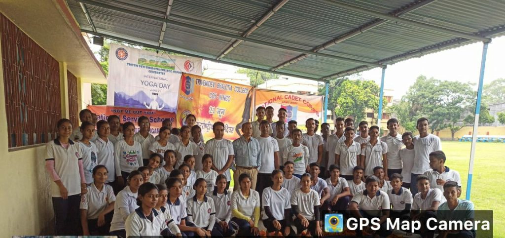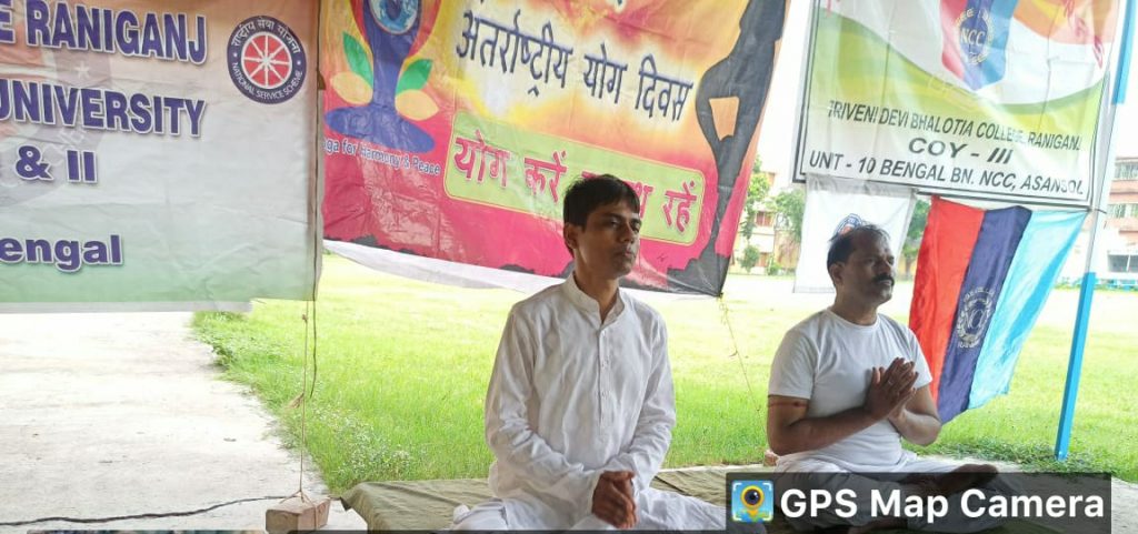रानीगंज :नौवें अंतर्राष्ट्रीय योग दिवस के अवसर पर त्रिवेणी देवी भालोटिया महाविद्यालय के एन सी सी एवं एनएसएस विभाग की ओर से आज 21 जून 2023 को योग दिवस मनाया गया । कार्यक्रम का आरंभ प्राचार्य के सम्बोधनीय भाषण से हुआ । एनसीसी ऑफिसर लेफ्टिनेंट डॉ. गणेश रजक ने योग के महत्व पर चर्चा की । एनएसएस ऑफिसर डॉ.आशीष गोराय ने भी योग के संदर्भ में अपनी बात रखी ।इस कार्यक्रम में रानीगंज शहर के दो जाने-माने योग प्रशिक्षक निताई गौराई एवं अशोक दत्त भी उपस्थित थे। दोनों प्रशिक्षकों ने कई आसनों एवं प्राणायाम को मंच पर प्रस्तुत किया ।दोनों विभाग के कैडेट आज के योग प्रशिक्षण से लाभान्वित हुए ।